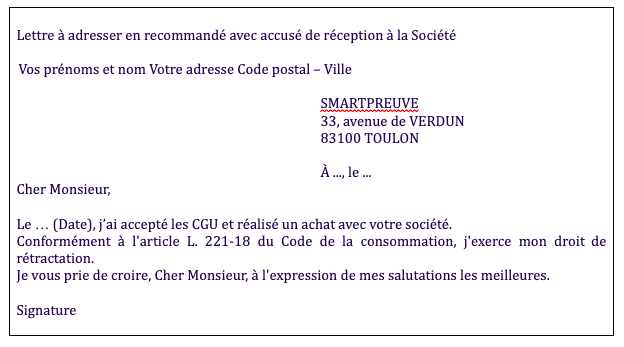 Je / Nous “Nom du ou des Clients” vous notifie / notifions par la présente ma /notre rétractation du contrat portant sur la vente du bien / pour la prestation de services ci-dessous :